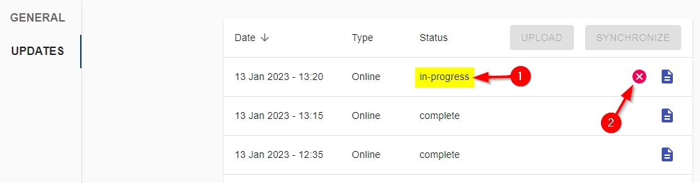 You can cancel an in-progress synchronization using the cancel button highlighted below (2). When a synchronization is cancelled, anything that has already been synchronized will remain, i.e. a rollback is not actioned, it is simply stopped.