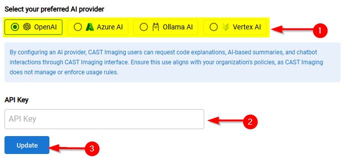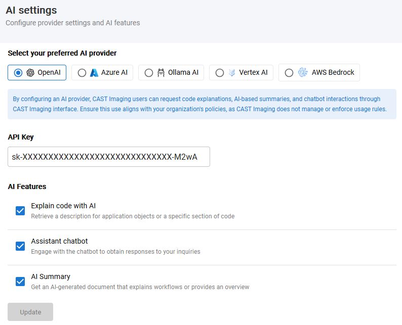 By entering an API key for an AI provider, CAST Imaging users will be able to send snippets of source code to an AI provider, via the CAST Imaging interface. CAST Imaging does not provide any specific governance of this, therefore you must ensure that your organization’s internal policies around AI authorize this usage.