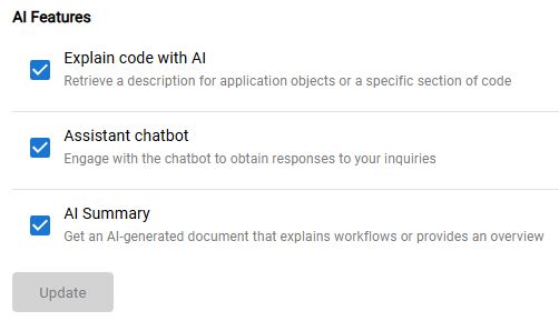 When a valid API key or configuration data is defined, the various AI feature toggles will become available. Use the check boxes to enable the features you require: