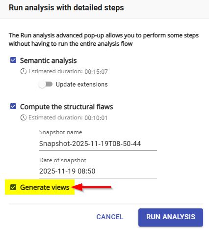 - If an application belongs to a domain (DOMAIN1) and a database (“tenant”) with the same name (DOMAIN1) already exists, the application will be uploaded to that same database (DOMAIN1) when the generate views analysis option is run.