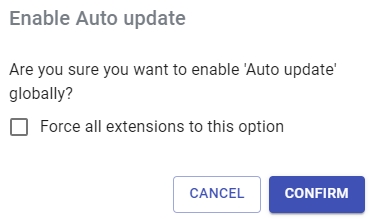 Ticking this option will ensure that ALL individual extensions are ALSO set to the same setting (either enabled or disabled), overriding any settings set at the extension level. Do not enable the tick box if you prefer to retain the individual Auto Update setting that you have manually applied: