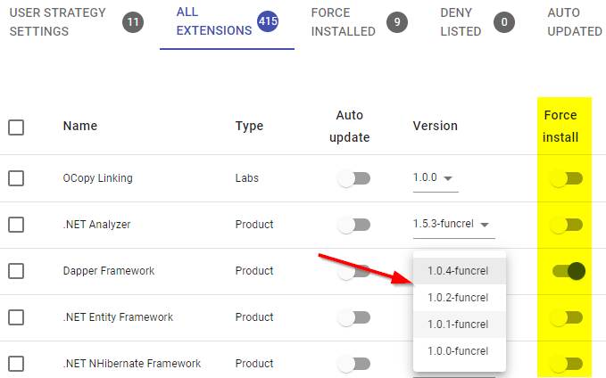 CAST sets some extensions to Force Install by default and with the latest release (at the time when your deployment was installed) in order to provide additional features and behaviour - see Force installed extensions.