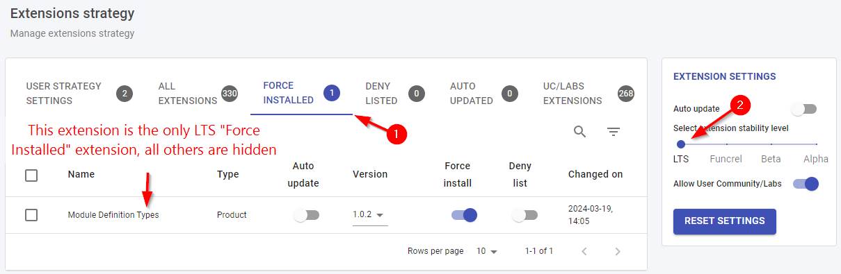 Alpharelease of an extension to Force Install, but you have set the Stability Level toLTSandFuncrelextensions, the specificAlpharelease of the extension will still be installed.
