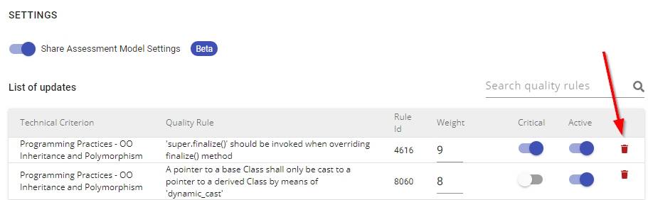 - The icon indicating that changes have been made to the rule at “shared” level will be removed from the rule in the Assessment Model page.