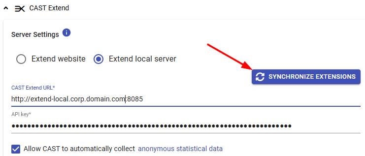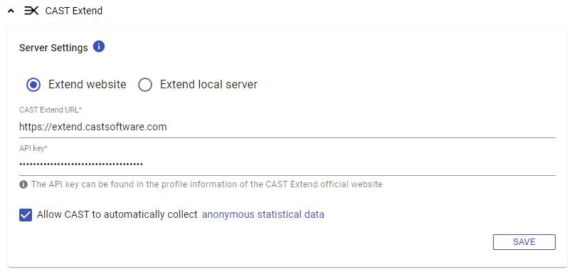 You can therefore use the panel to update the settings for CAST Extend, i.e. if you want to change the user name, or if you want to start using Extend local Server.