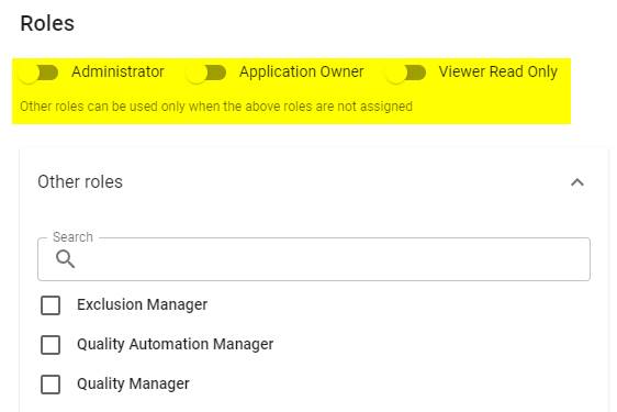 If you assign the Administrator, Application Owner or Viewer Read Only roles, no other roles can be assigned: