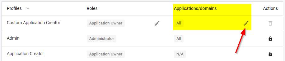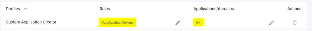| Application Creator | Access to onboarding (i.e. allows new applications to be added or imported), analysis and configuration features with the following roles: - Application OwnerThis implicitly includes all of the following roles: - Exclusion Manager- Quality Automation Manager- Quality Manager- App-To-App Dependencies - Manage Bulk Import- Manage Custom Object Types- Manage Level 5 View- Custom Aggregation Access- Services Views Access- Source Code Access- Generate Automated ModulesUsers with this profile will have the Application Owner role over their own applications.Specific Applications/Domains cannot be assigned to this profile. |