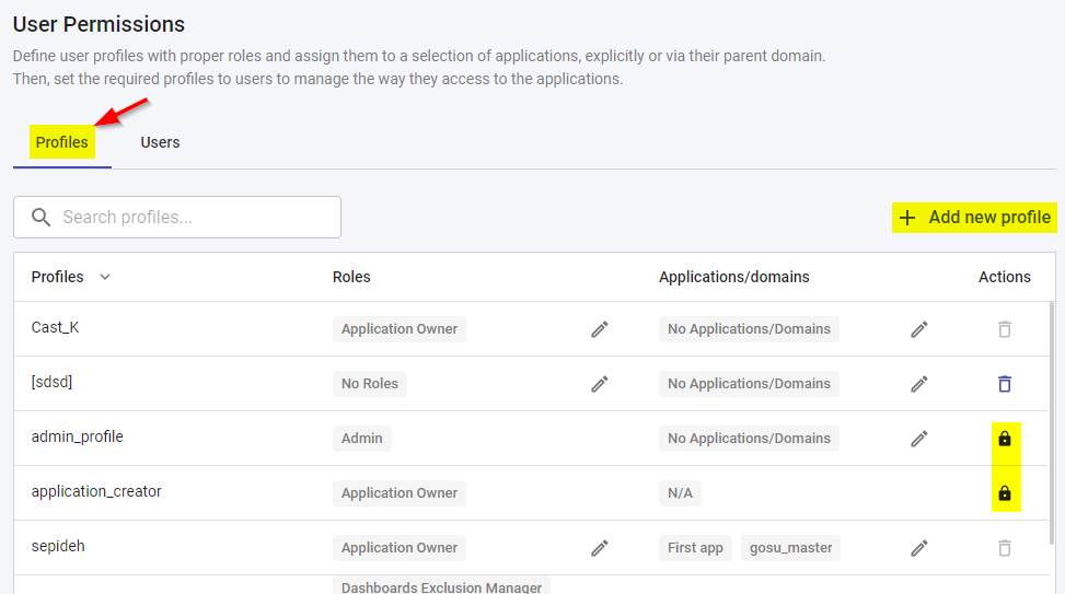 Default profiles are managed in the Profiles tab where you can also define your own custom profiles. Default predefined profiles cannot be removed and are flagged with a “padlock”: