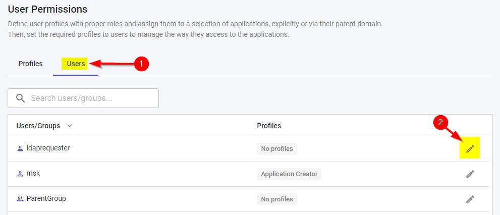 Permissions are assigned to users or groups of users via a profile using the Users tab. You can assign any of the default profiles, or you can create your own custom profiles using the Profiles tab: