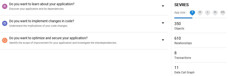 - Welcome page: the default setting out of the box providing you with a dedicated “Overview/Welcome page” for your application showing details about the application (total number of objects, LOC value, number of transactions etc.) and provides various tailored views of the items in the application (e.g. : all Database Tables, all Modules etc.):