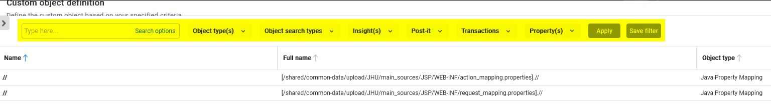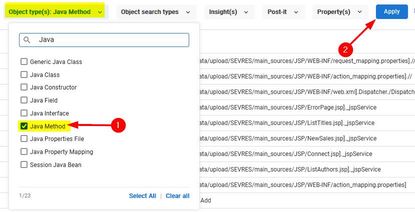 In this example we want the node to contain only Java Method object types, so we can use the Object type filter: