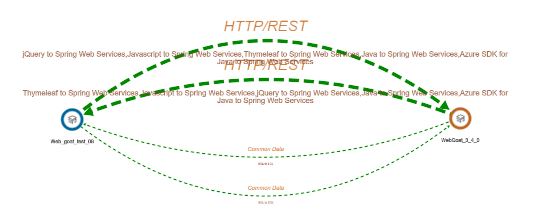 Where an interaction exists, a green dotted line between the two applications will be displayed in the view, together with information about the type of interaction that exists (i.e. the specific mechanism used in the source code). In addition an arrow head indicates the direction of the interaction(s) - for example: