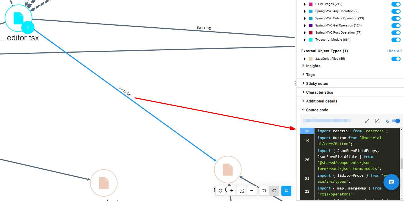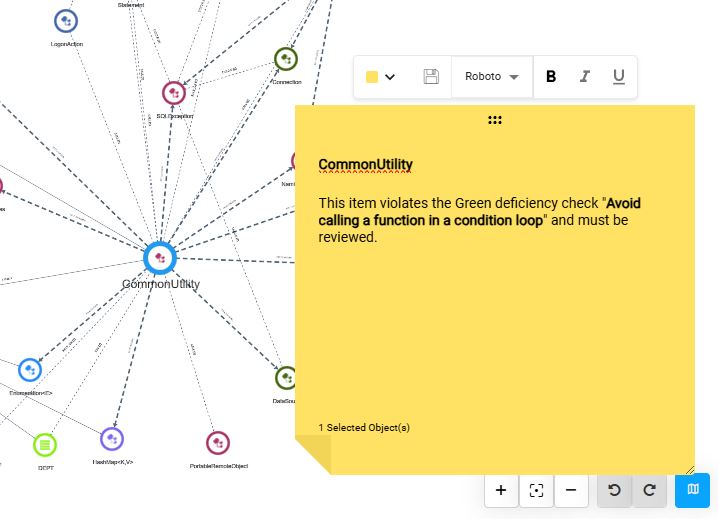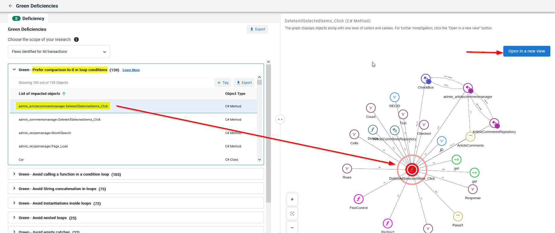 Once you have a list of the green deficient items, the next step is find out where these components are being used in your application so that you can plan to update them. The right panel shows a high-level view of the items containing the deficient code. Clicking the Open in a new view button opens up the relevant objects and nodes in full screen mode. A hypothetical example is explained below.