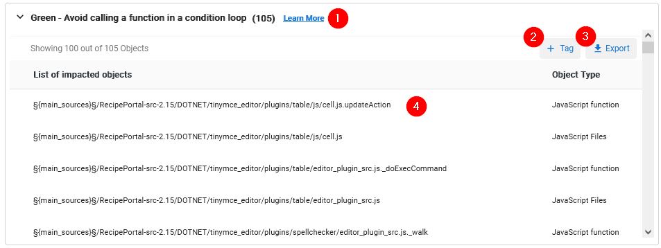Clicking the Green deficiencies tile will display the following screen, where a list of “green deficiency” type checks provided by CAST Highlight will be displayed in a left-panel with a corresponding object view to the right: