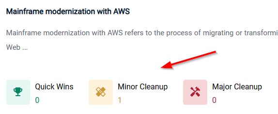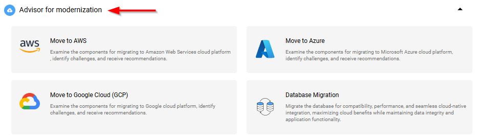 - If your application contains technologies for which checks are available, then the Advisor for modernization section will be displayed: