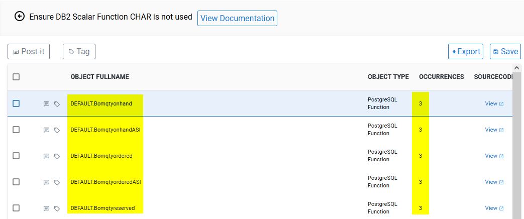 Once we have drilled down through the workflow, we can see a list of all objects where CHAR() is used and the number of times it is used in each object: