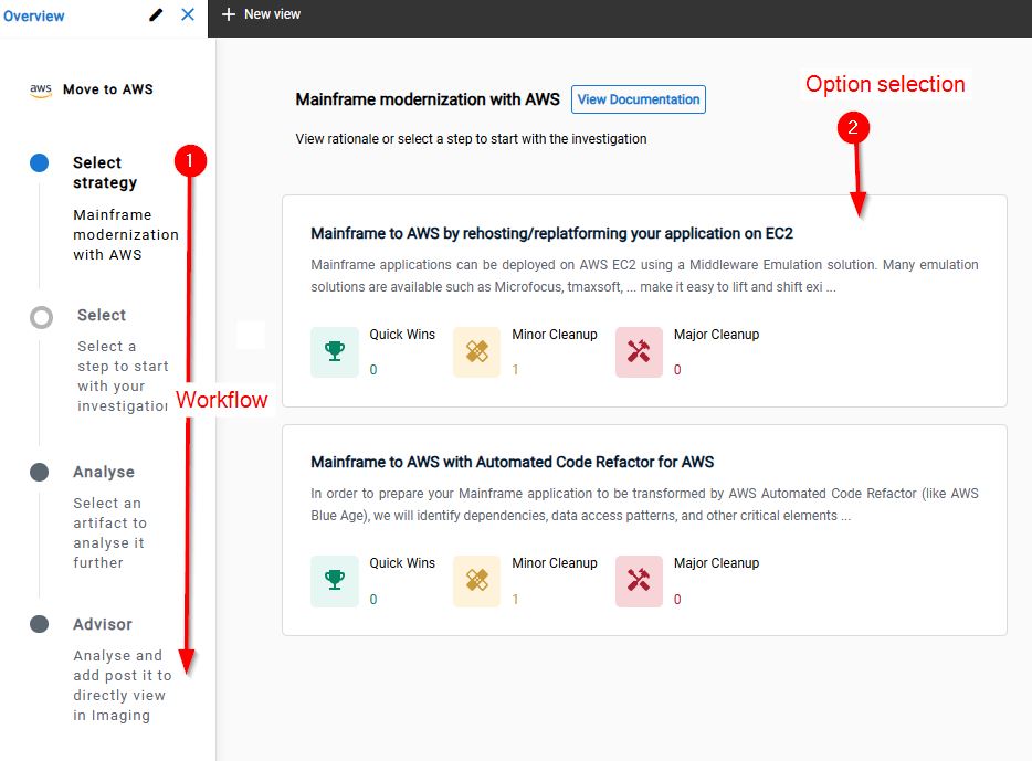 - click the scenario you are interested in, for example if you are considering migrating your Mainframe application to Amazon Web Services, click the Move to AWS button.