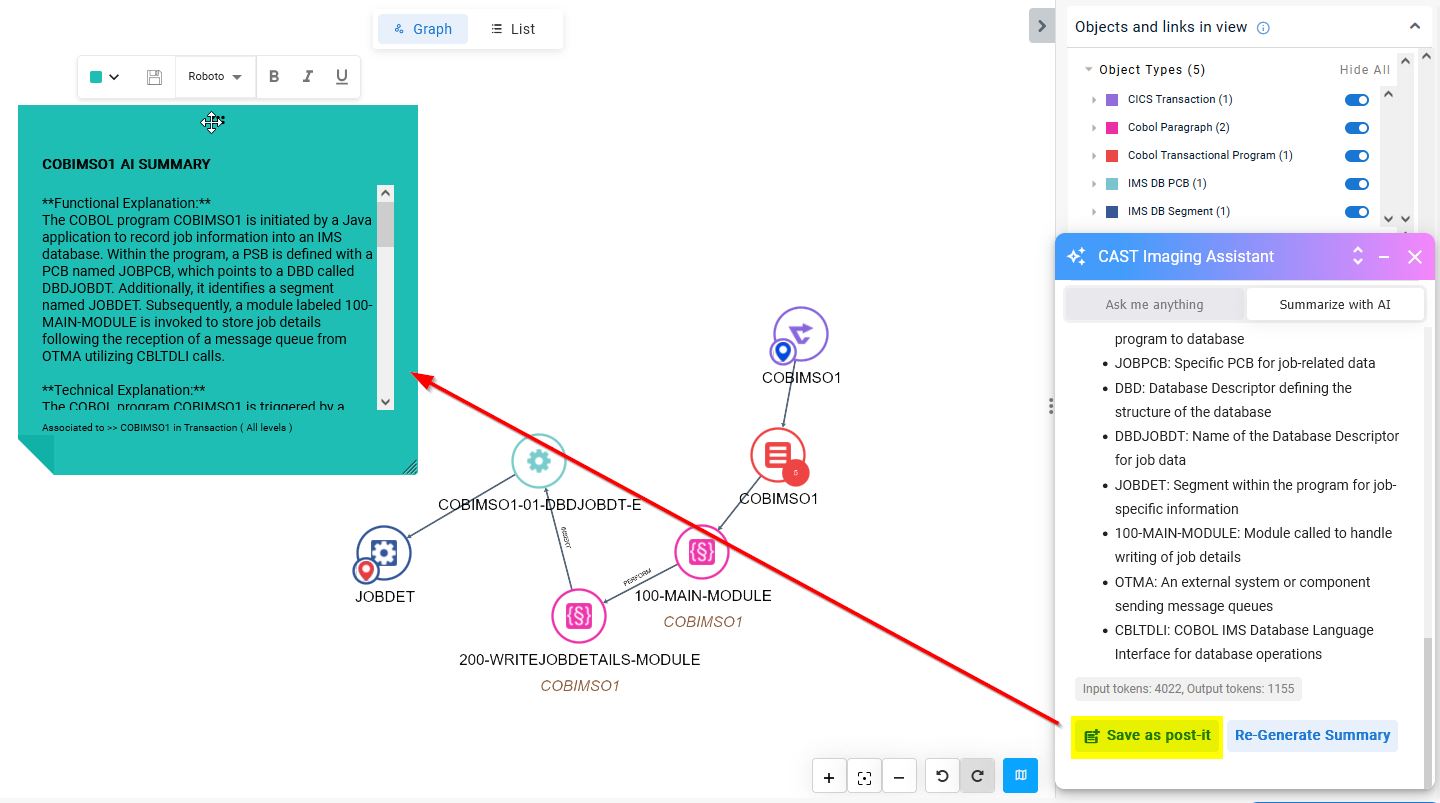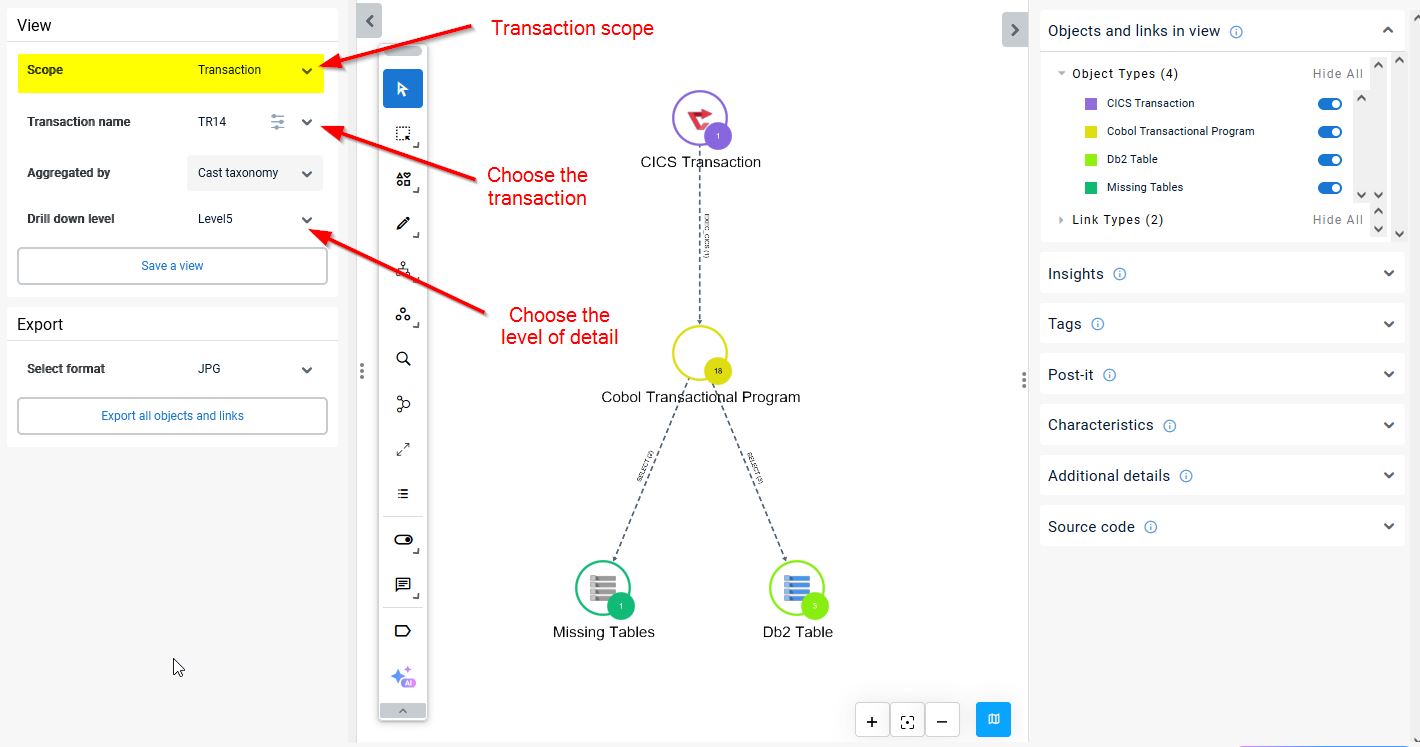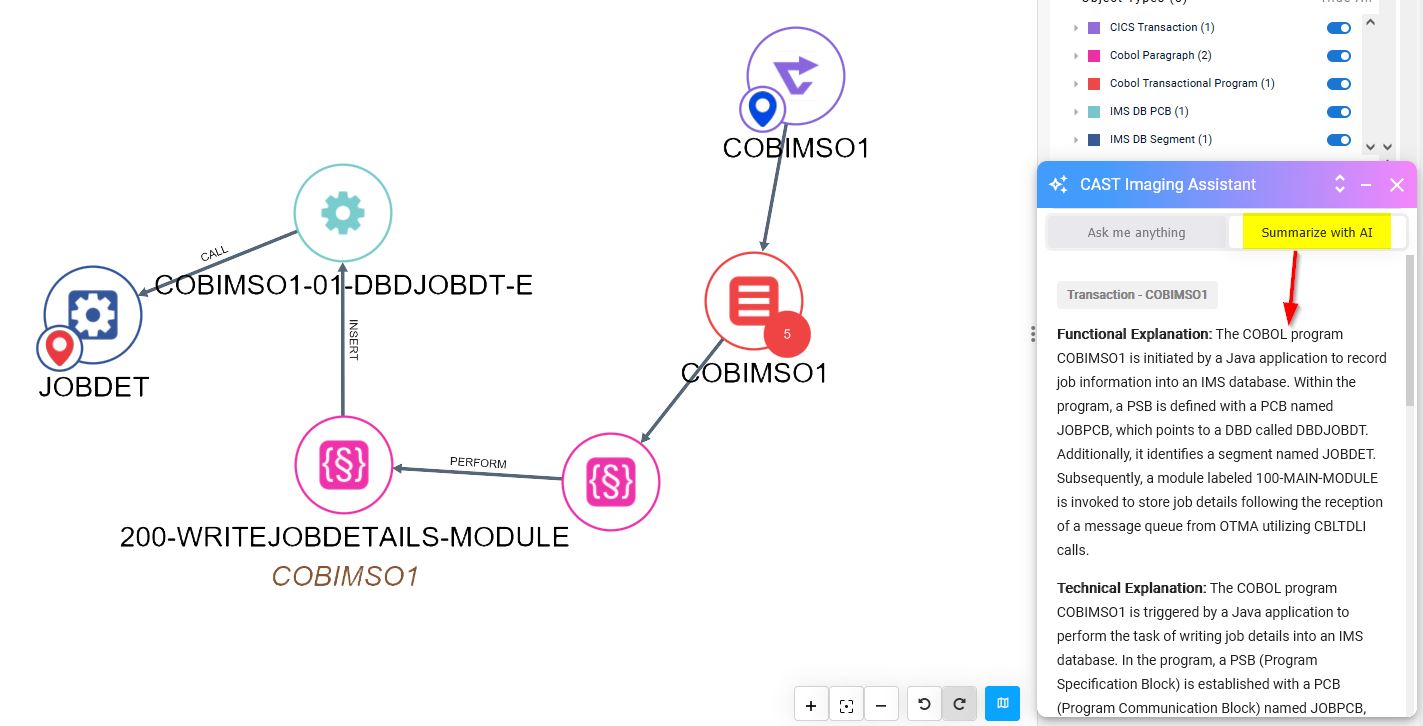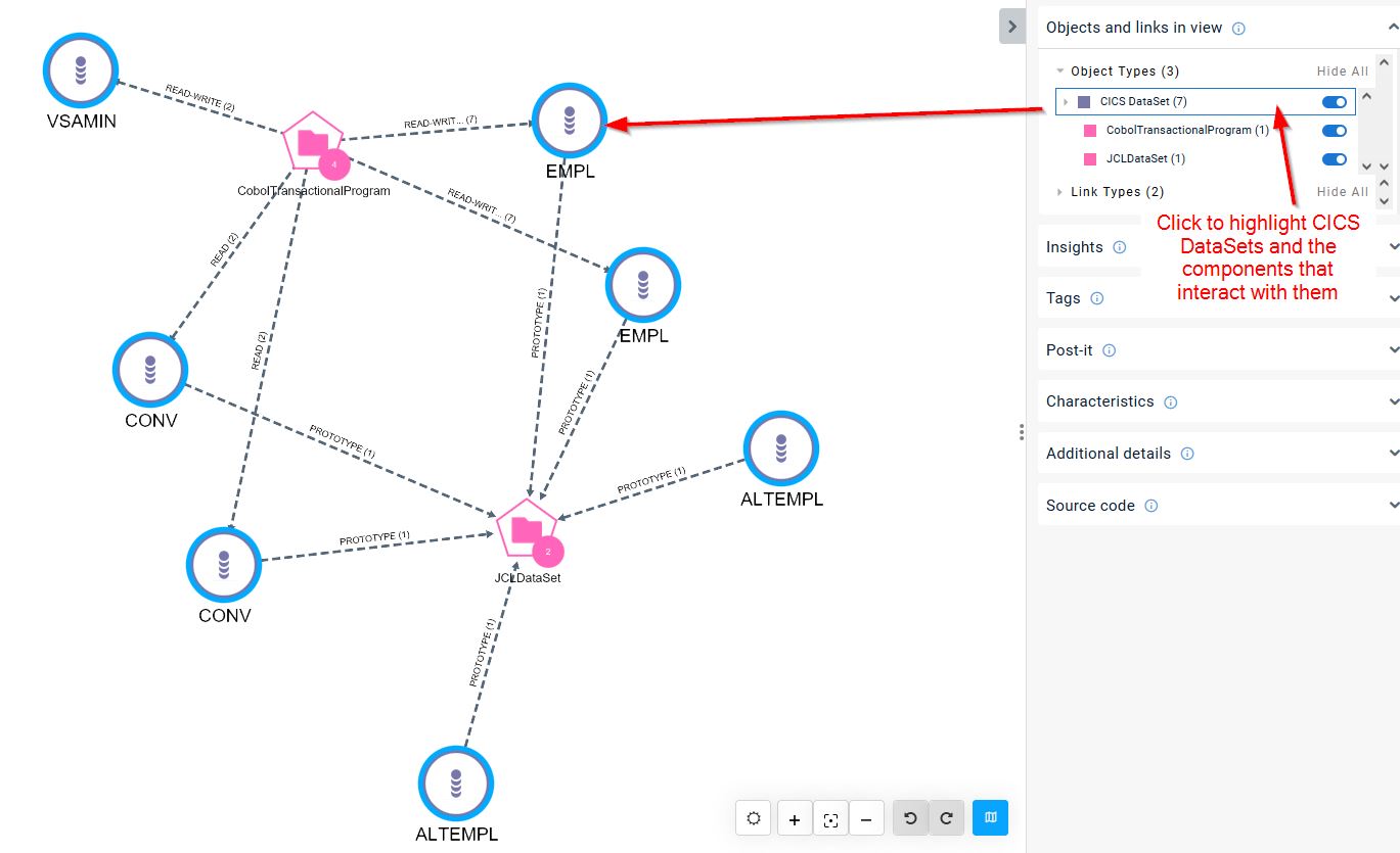 - CICS DataSets: Transaction-specific datasets incompatible with container platforms. You can easily locate these items using CAST Imaging’s objects and links display configuration in the right-panel:
