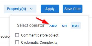 - Property (filter on objects with a matching property such as Number of Code Lines, Cyclomatic Complexity etc. - see also Search Configuration for more information about changing the properties that are available to users)
