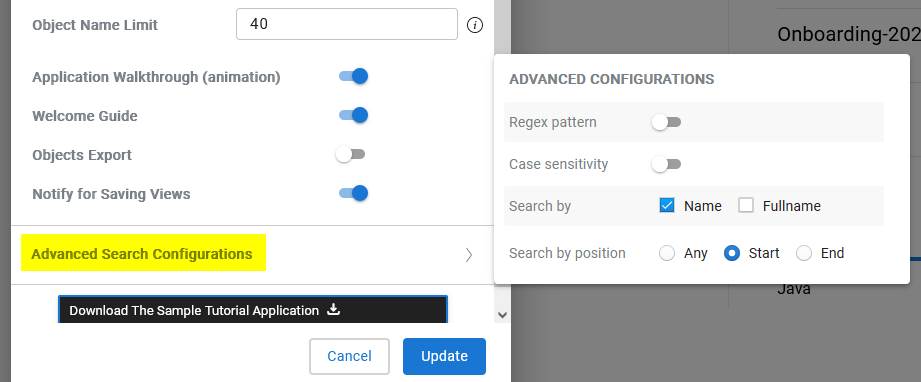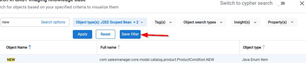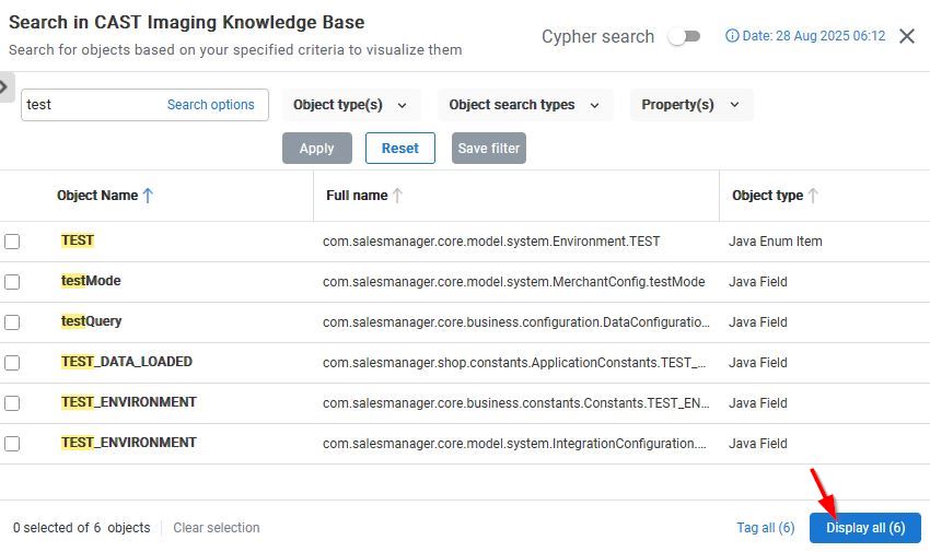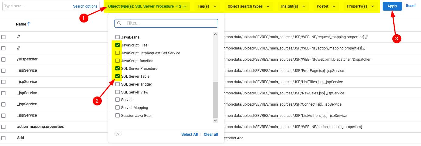 - Object type (filter on specific objects such as Java Field, SQL Server table etc.)