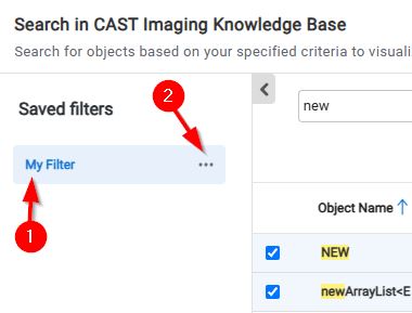 A saved filter will appear in the left hand panel of the search window and can be re-used whenever required (marked as “1”) below. Use the action menu (“2”) to Rename or Delete existing filters: