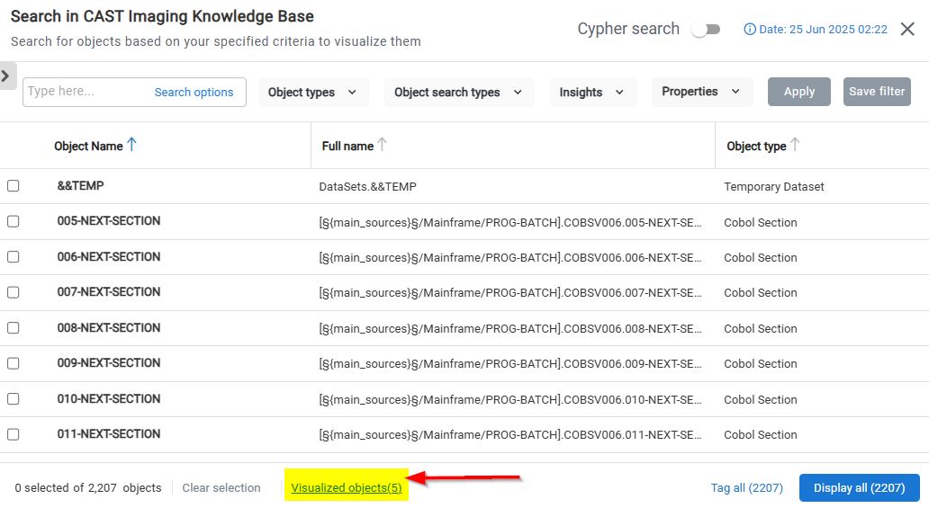 You can visualize the objects that are ALREADY in the view using the Visualized objects link in the lower part of the search dialog (this is a simple list of objects - all functionality in the pop up is disabled):