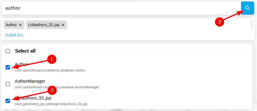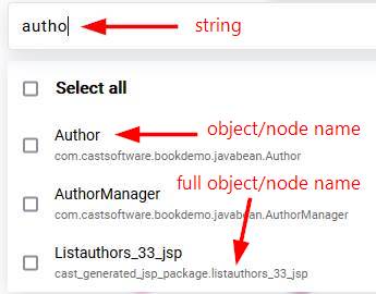 - highlights the objects in the view that you have searched for: select (using the check boxes or mouse click) all the items you want to highlight, then click the search icon in the top right: