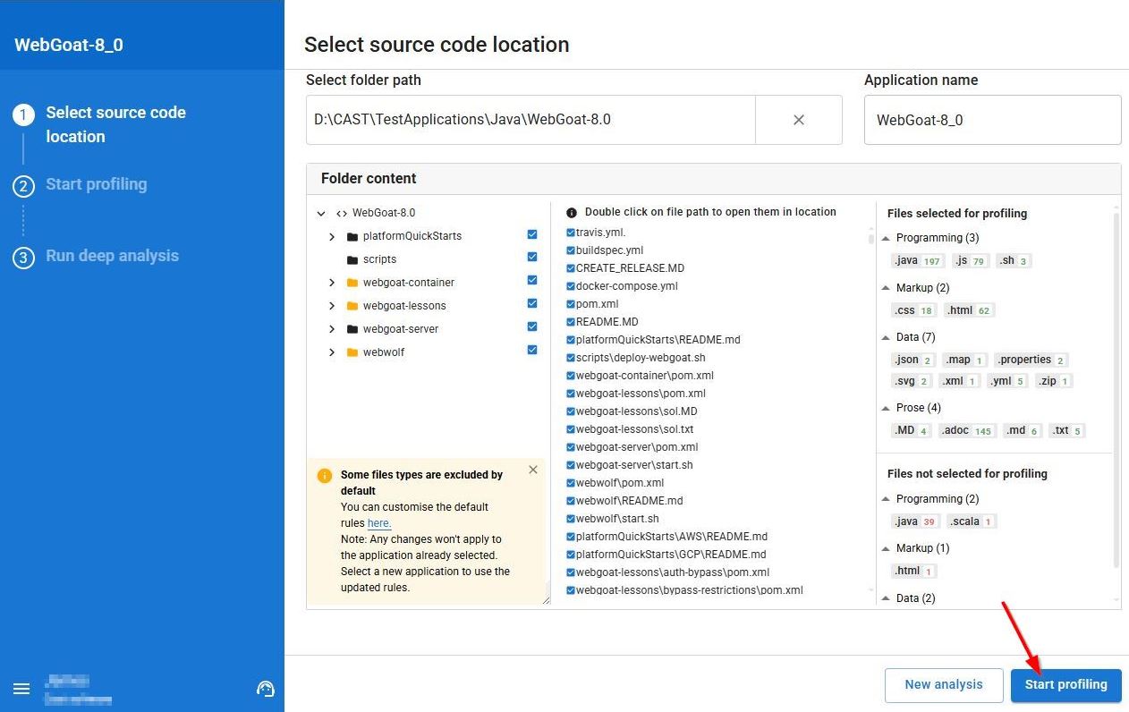 - On your local machine, select your source code, choose a name for your application and run a profiling: