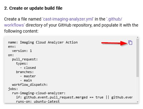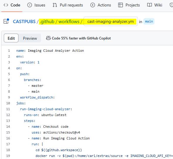 In your GitHub account, navigate to the Code tab and create a GitHub Actions build file called cast-imaging-analyzer.yml in .github/workflows in the main or master branch:
