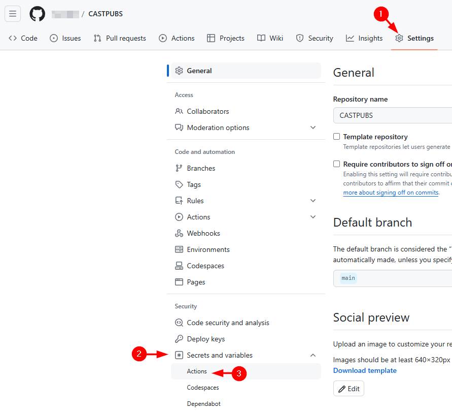 In your GitHub account, navigate to the repository containing your application source code, then Settings > Security > Secrets and variables > Actions: