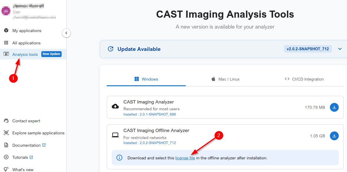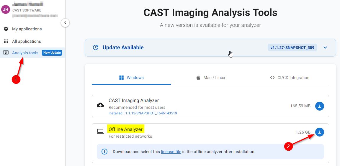 When logged in to your CAST Imaging on Cloud Saas account, click the Analysis tools then choose the Offline Analyzer download option: