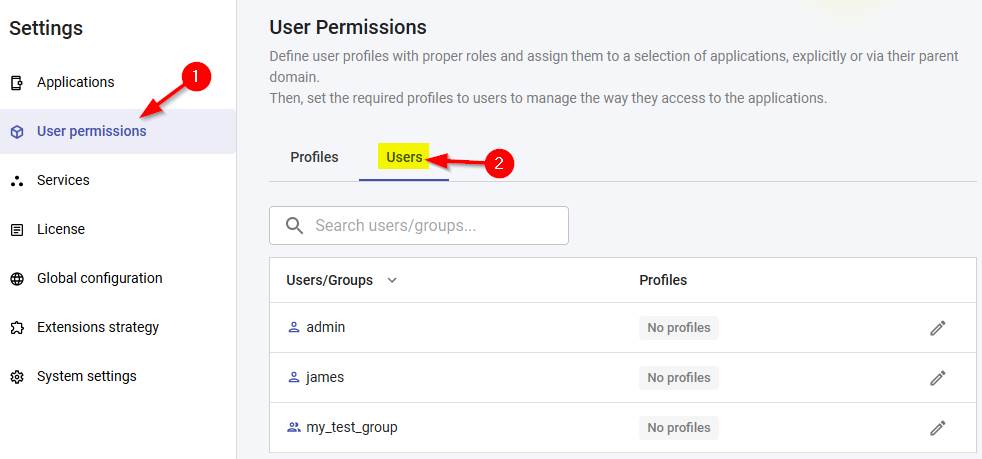 As soon as a local user or group is created, it will be visible in the CAST Imaging User Permissions interface (accessing this requires a login that has the ADMIN profile). Use this interface to grant permissions to your users and/or groups: