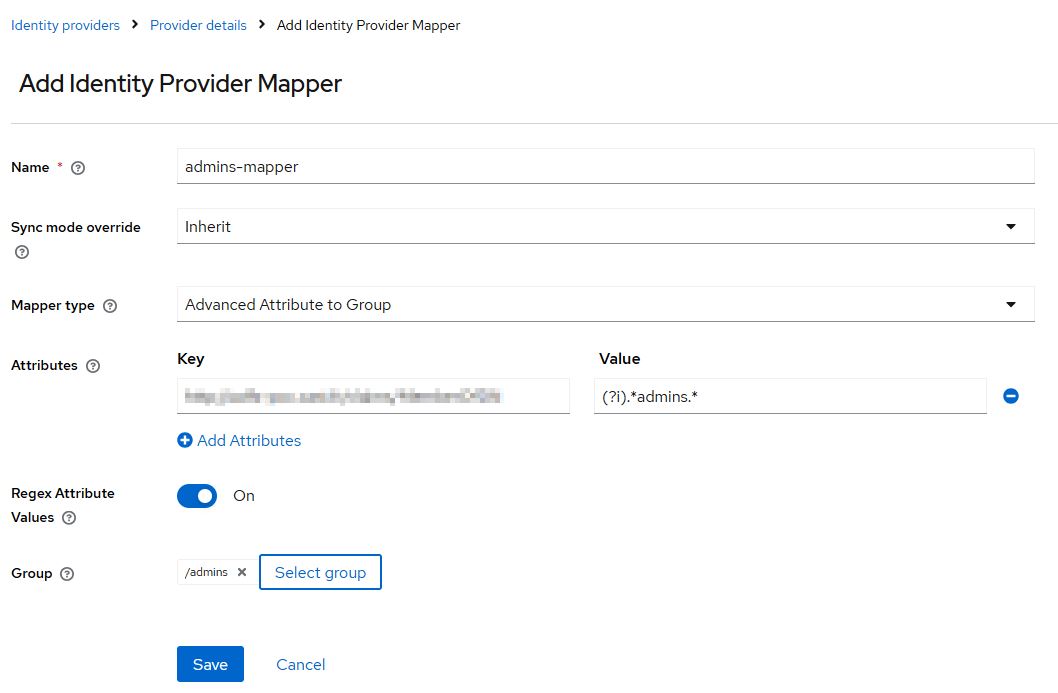 http://schemas.microsoft.com/ws/2008/06/identity/claims/groups - Value: Enter a regular expression pattern to match the Keycloak group name, for example