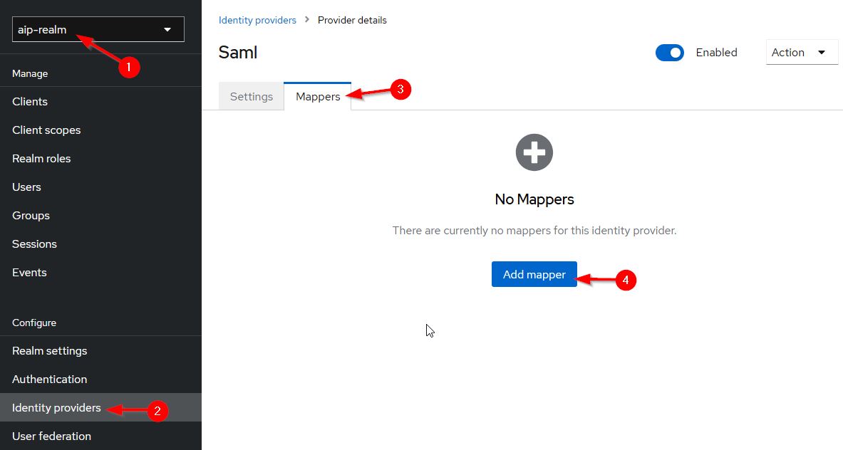 For each group that you created previously, you will need to configure a mapper specifically to synchronize the IDP group with the Keycloak group. To do so click the Mappers tab in your SAML User Federation setting and click Add mapper: