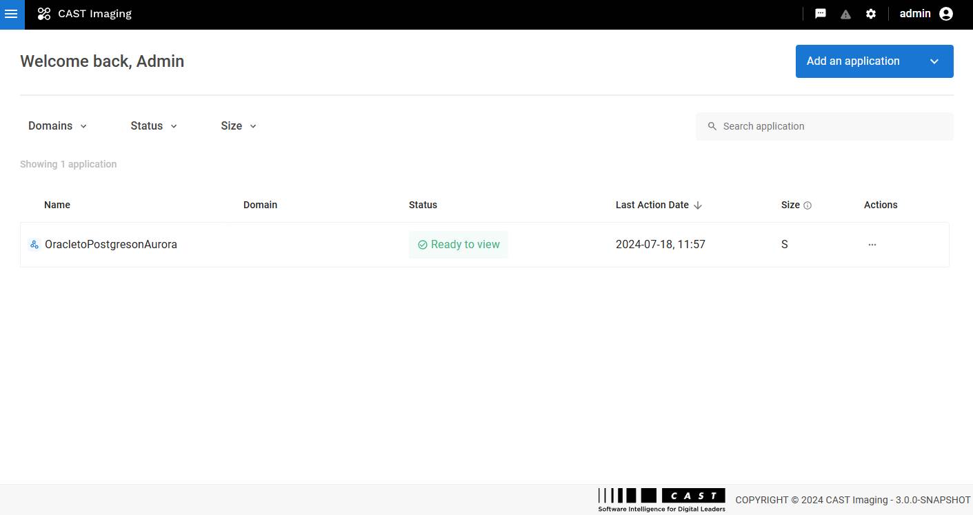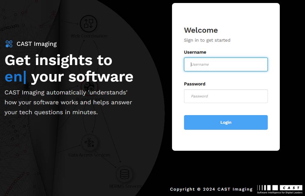 There is one single point of entry for all users, whether Administrators, Application Owners or simply those that need to view analysis results: this is known as CAST Imaging and is accessed in a web browser. All actions are completed using this component: