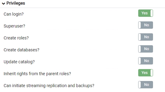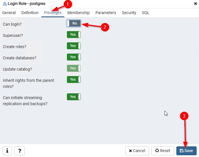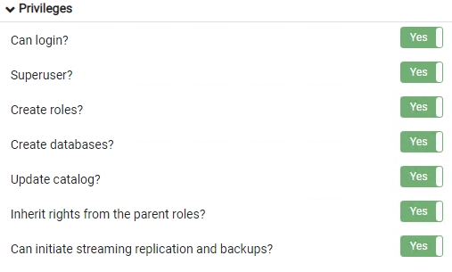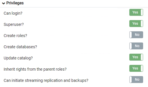 - | The postgres user/role is created by default with the privileges as listed in the images below:![]() If you are concerned about security, you should disable logins for this user/role, and/or change the default password: Disable login Using PgAdmin (which is bundled with CAST Storage Service):