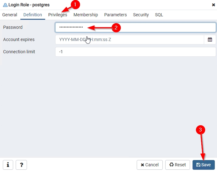 ![]() Or use a SQL query: ALTER USER postgresWITH PASSWORD 'password'; |