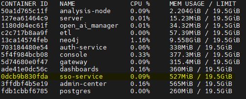 Look for the sso-service container in the output to confirm its memory usage matches your configuration: