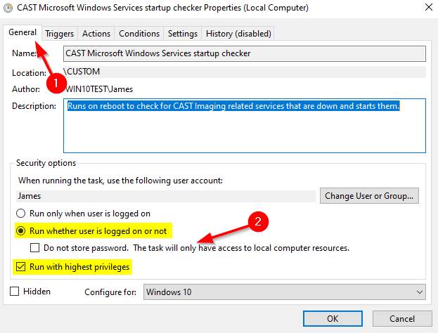 Run whether user is logged on or notandRun with highest privilegesoptions: