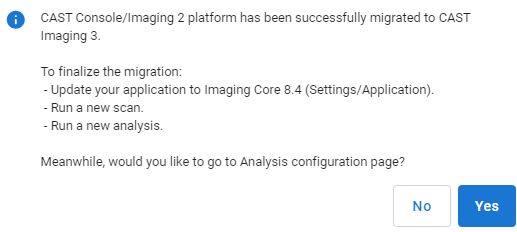 Determines whether you want to backup the CAST Imaging v3 schemas analysis_node and admin_center before the v2 data is migrated in. By default this is set to Yes, set to No to skip this backup. |