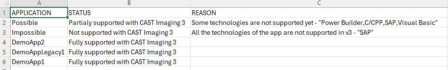 Some technologies that are fully supported in v2 are not (yet) supported in CAST Imaging v3 - you can see a list here. To help you decide whether you can migrate your applications, CAST’s backup and migration tools can be run in “test” mode with results output to a report. The report provides key information about your applications and their eligibility for migration (i.e. whether they contain unsupported technologies and whether they can be migrated or not) - this is explained below. CAST highly recommends that you use the “test” mode BEFORE you embark on a real migration.