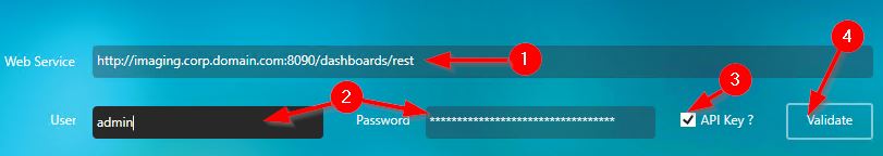 Open Report Generator and enter the URL of your CAST Imaging installation with /dashboards/rest appended to the end (for example: http://imaging.corp.domain.com:8090/dashboards/rest) into the Web Service field. Next, enter a valid user name into the User field and then enter the user API Key into the Password field. Ensure you also tick the API Key option: