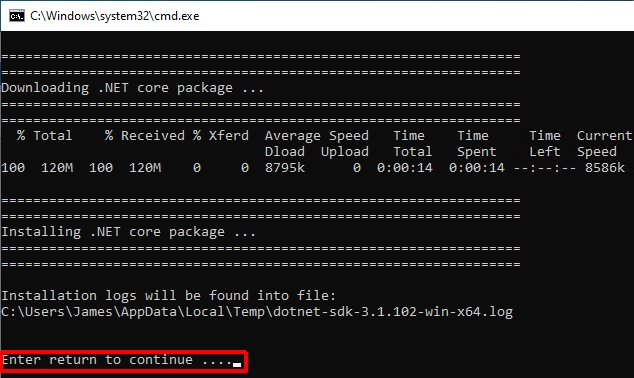 If you choose to install the Microsoft .NET SDK (≥ 1.15.x only), a command window will open and the SDK will be downloaded. You need to tap ENTER on your keyboard to allow the installation to proceed: