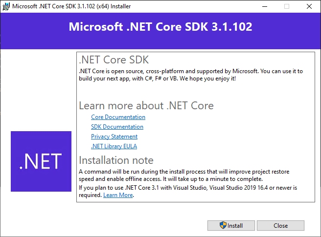 Execute the downloaded .exe file and follow the installation wizard. You will be prompted to choose installation folders for executables and for templates. On completion, the installer will then offer to install automatically the Microsoft .NET SDK.