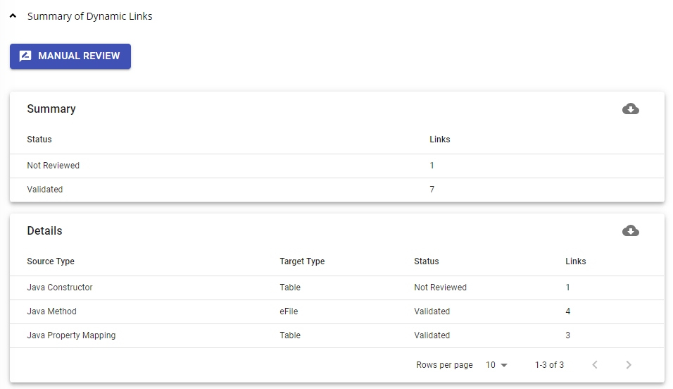 The Summary section provides a basic overview of the status of Dynamic Links in the Application as a result of the most recent source code analysis. Clicking a row in the table will take you direct to the Manual Review section (see below) with a filter applied to match the contents of the row.