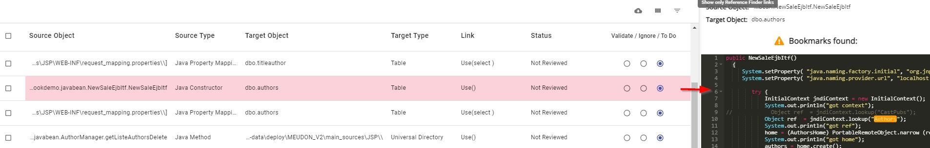This button opens a new window where you can manually review each link. By default the window will show all links that need to be reviewed - i.e. all links that are still considered to be “unverified”. The first link in the list will be selected and the source code that creates the link will be displayed automatically, along with the specific object highlighted (this is known as a bookmark) - this will help you decide whether the link is correct and needs to be marked as valid, or whether the link is invalid and needs to be marked as ignored: