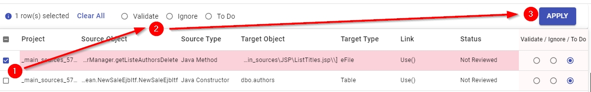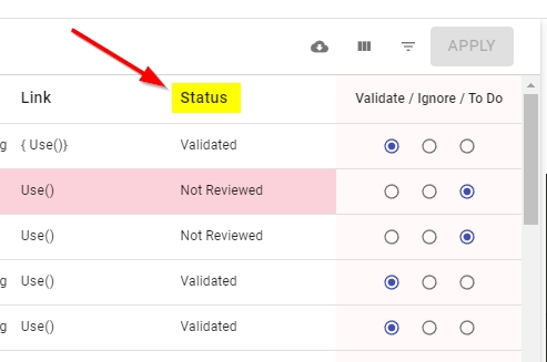These radio buttons allow you to choose what to do with the link after reviewing its code. Select the appropriate option for the link and then click Apply in the top right corner to confirm the choice. You can use the check boxes to review multiple links: