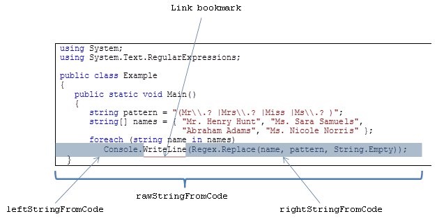 <leftStringFromCode regexp="string"/> - the text before the link, from the first column of the same line<rightStringFromCode regexp="string"/>- the text after the link, to the last column of the same line<rawStringFromCode regexp="string"/>- the whole text, including the left part and the right part