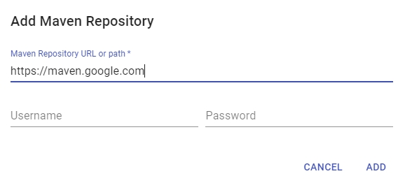 - Remote repository: enter the URL to the repository (e.g.: Google’s repository https://maven.google.com )