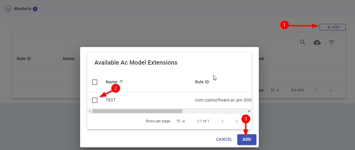 - Architecture Models are published as specific extensions and this screen allows you to assign any number of existing Architecture Models to the current application using the Add button.